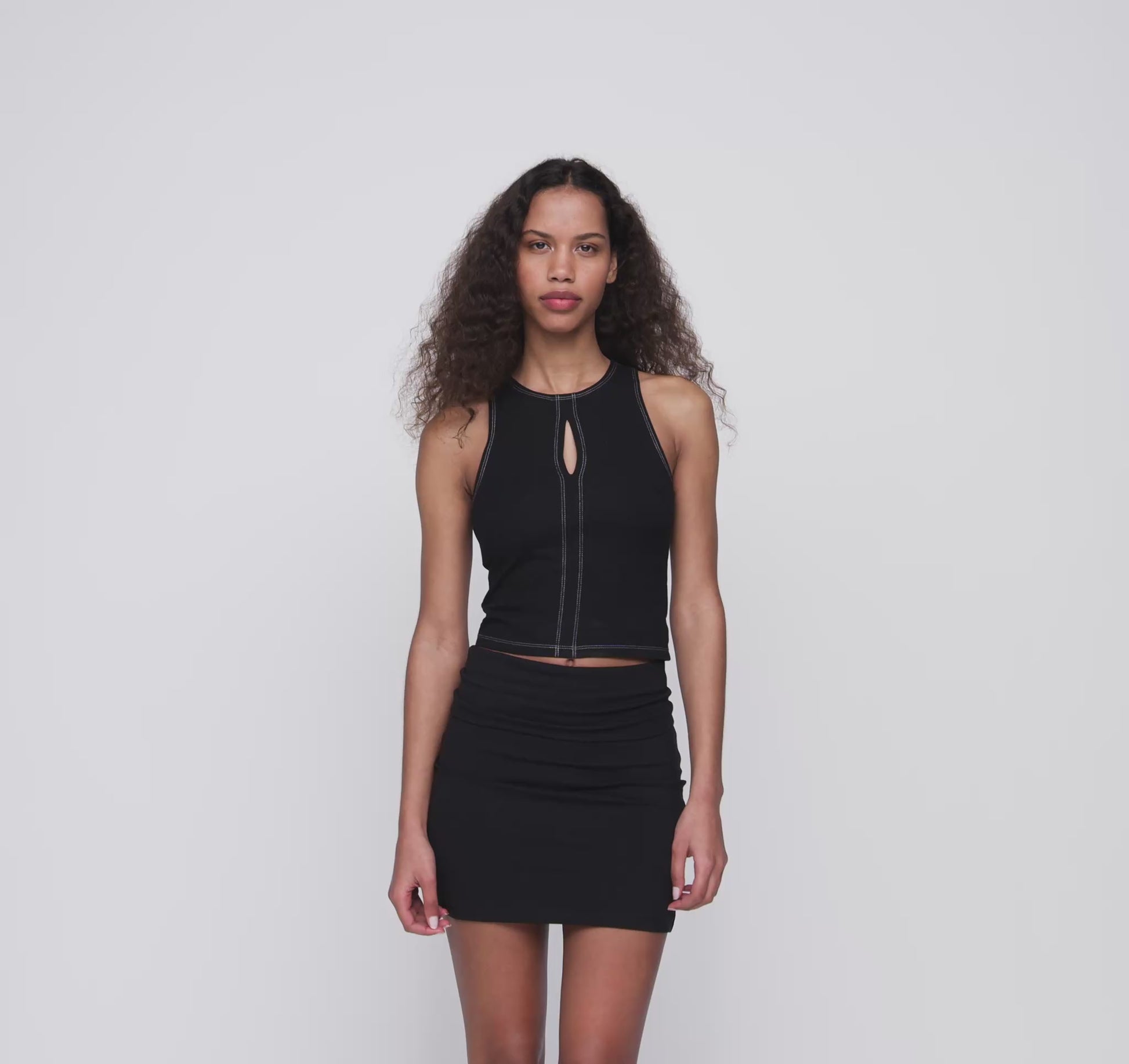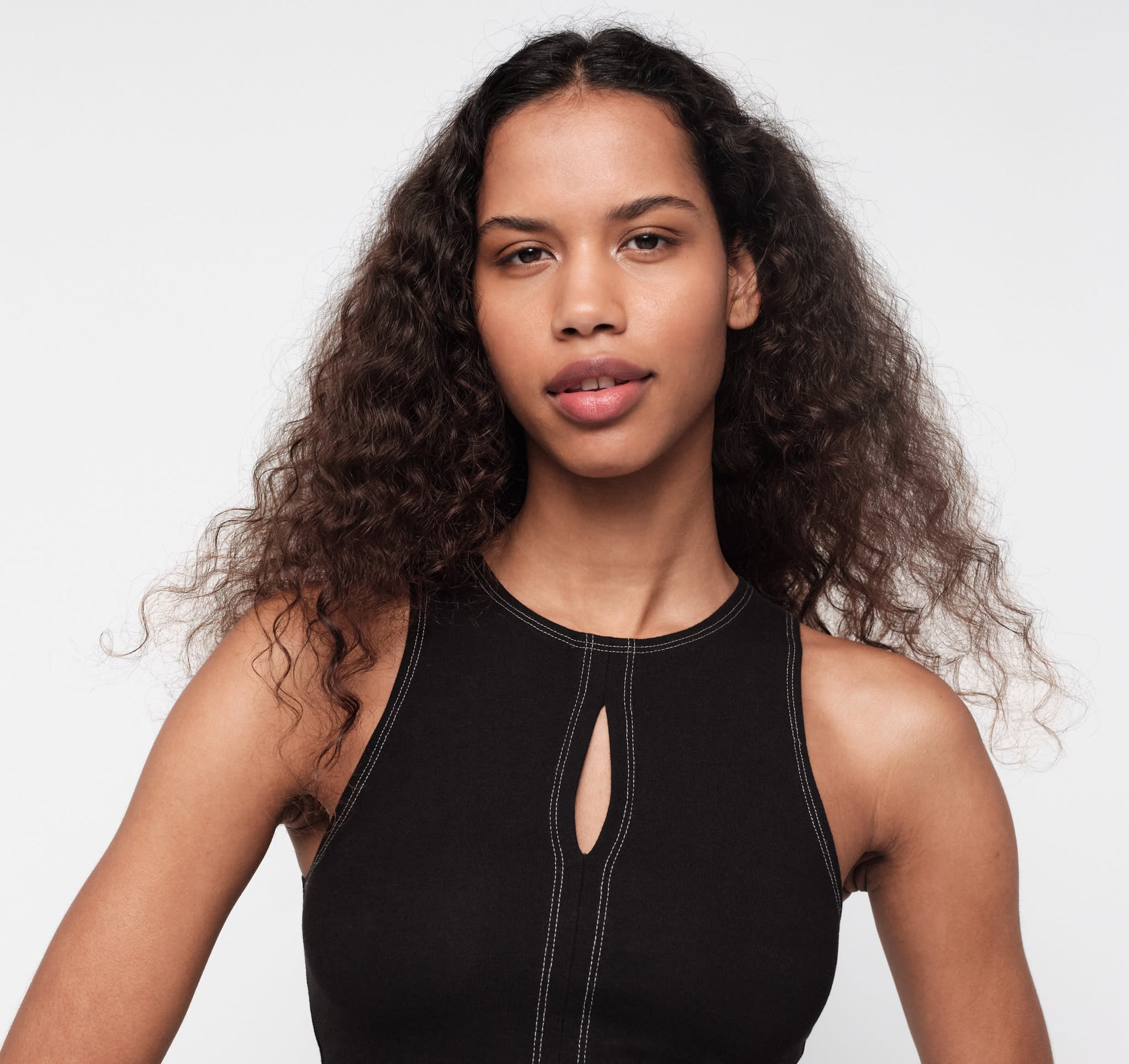 - Cut-out bust detail with contrast stitching