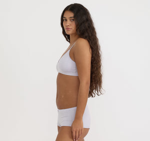 • Pull-over style bralette featuring a low-cut, rounded neckline.