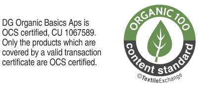 Products certified to the Organic Content Standard Blended (OCS Blended) contain between 5-94% certified organically grown content that has been independently verified at each stage of the supply chain, from source to final product. Organic cotton is produced and certified to organic agricultural standards, which require practices to sustain ecosystems. Organic Basics is OCS certified, CU 1067589. Only the products which carry the OCS label and claim are certified.