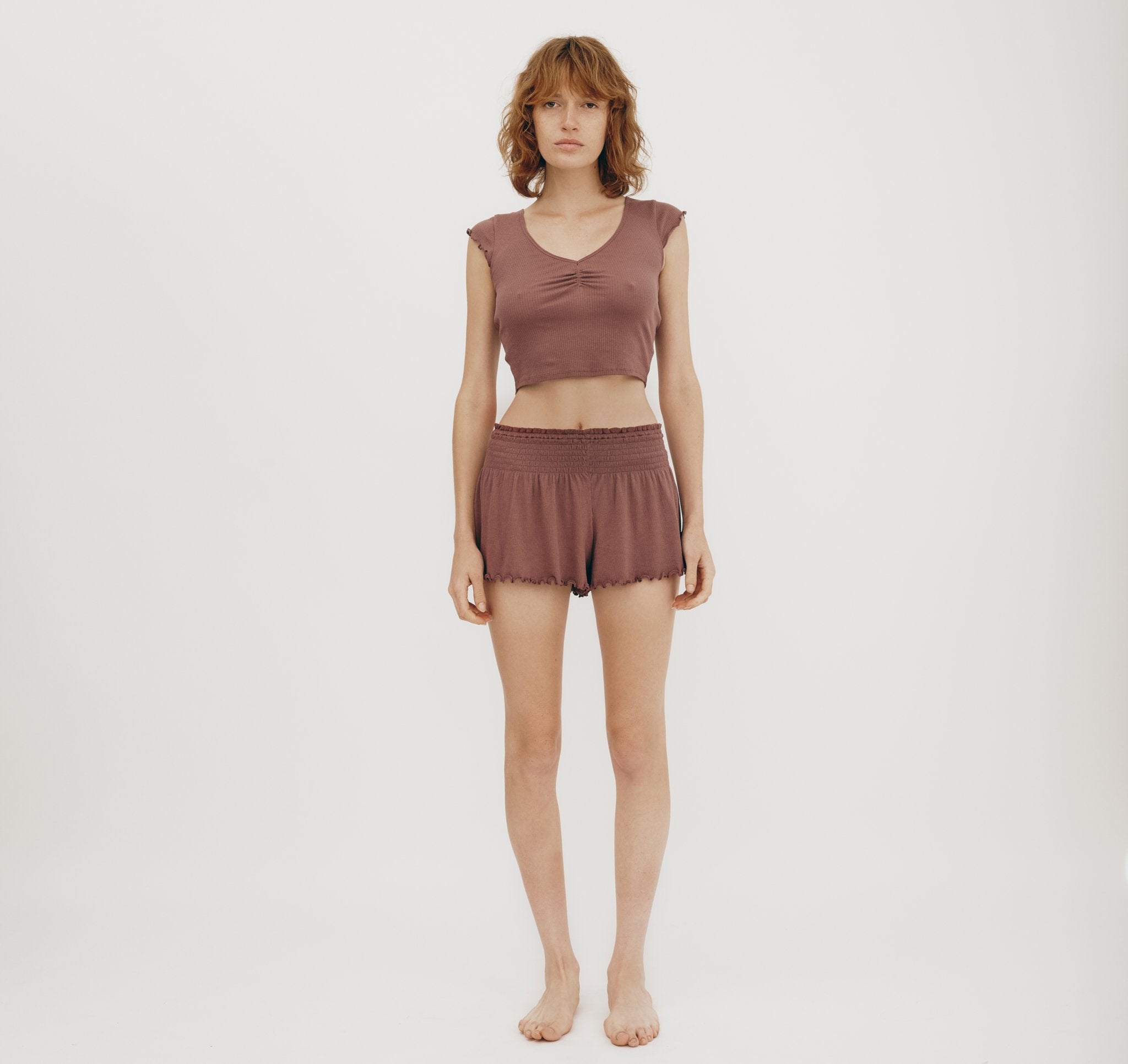 Mini, smocked shorts made with 95% organic cotton in a 5x2 rib. Features a fluttered hem for a delicate look and feel.