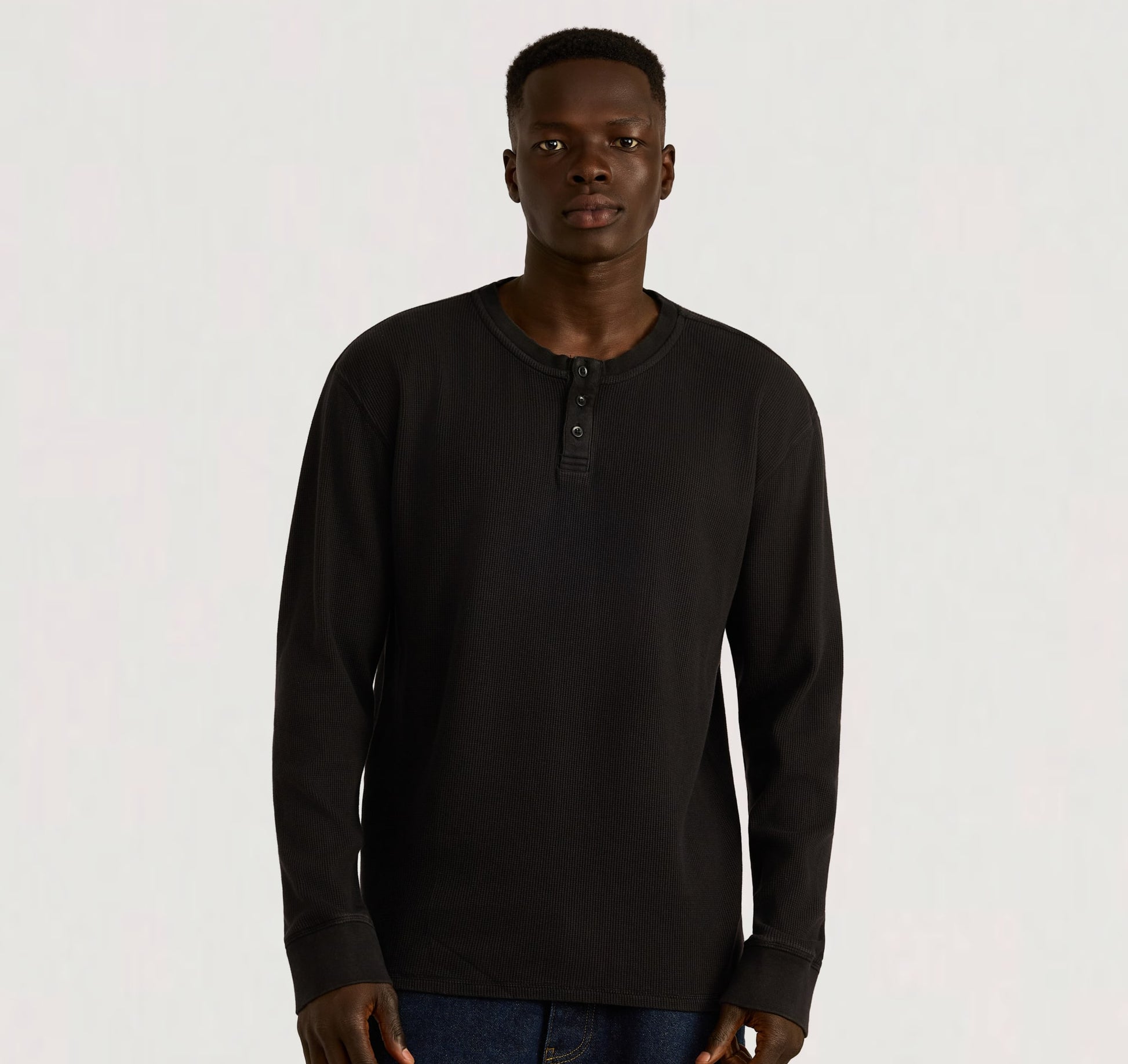 Feels like something you’ve had forever. Nostalgic, textured, soft, and just the right amount of slouch. This waffle-knit henley layers easy, and wears even easier.