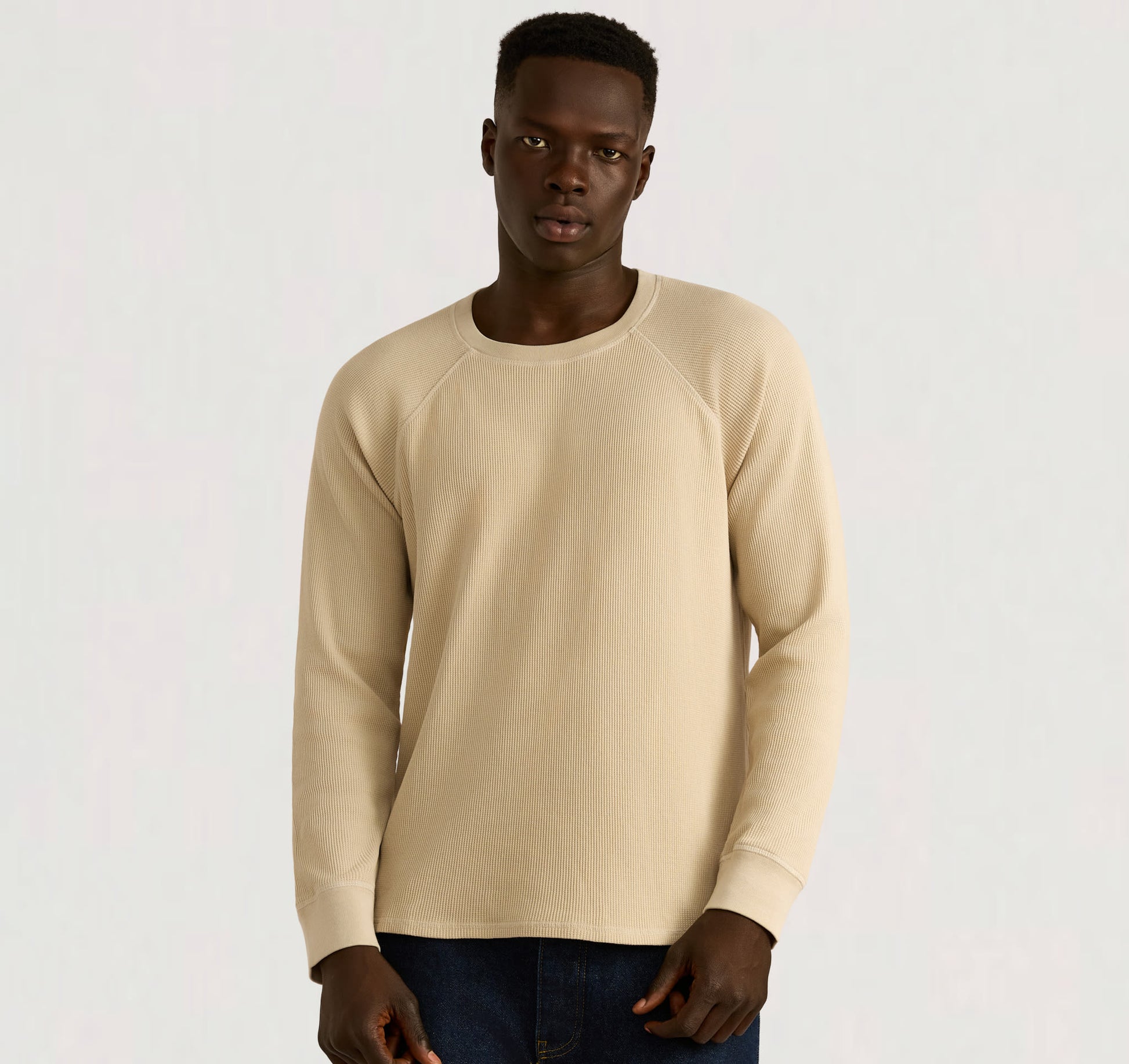Laid-back, textured, and made to layer. This waffle-knit raglan brings easy, everyday comfort with a bit of edge.