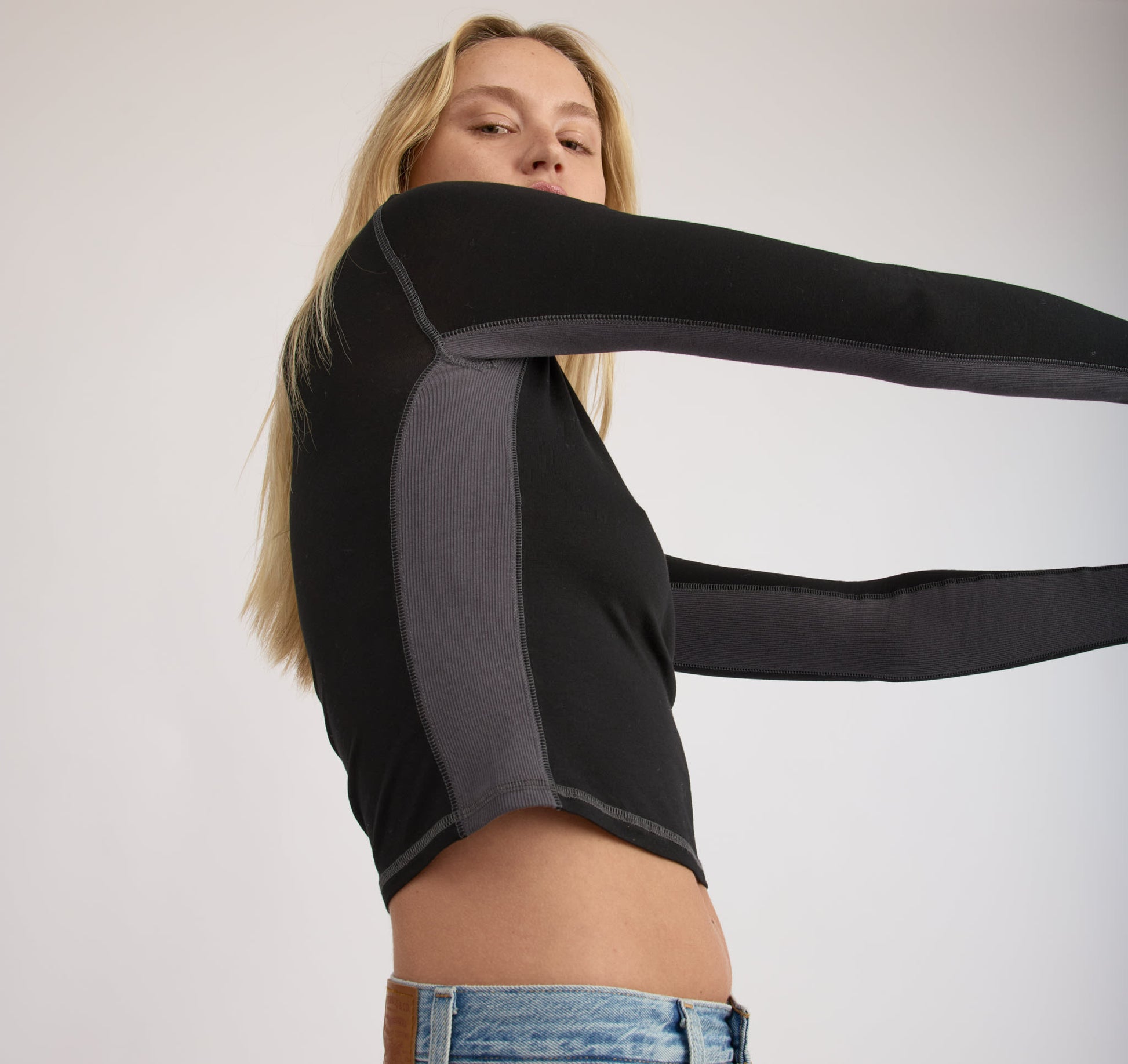 • Soft, stretchy ribbed side panels along torso and sleeves.