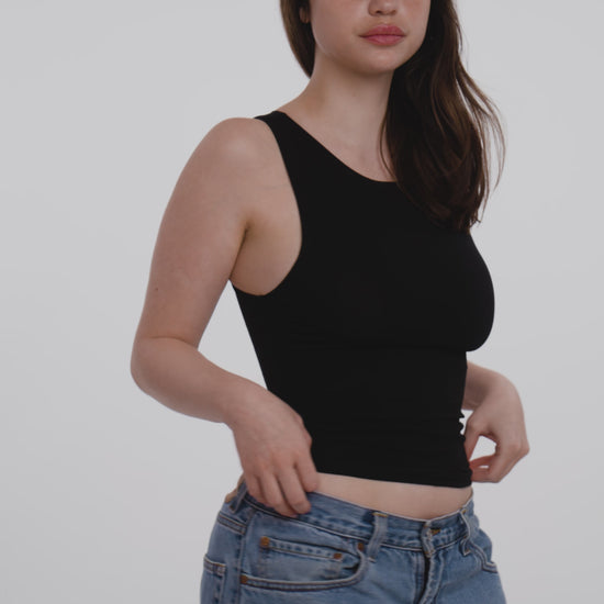 • Slim-fit sleeveless top with a flattering boat neckline.