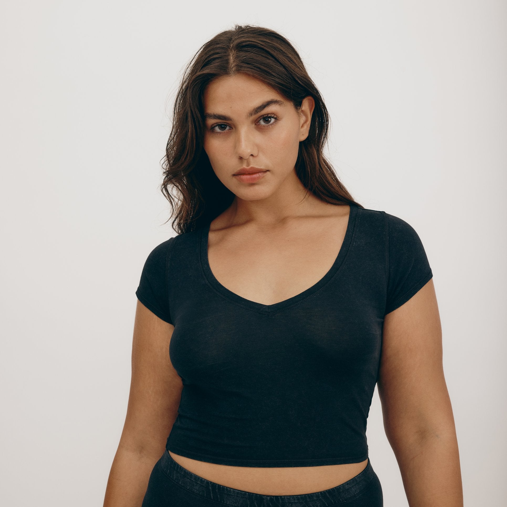 Stretch, baby! This soft, form-fitting v-neck tee made with 95% organic cotton features short sleeves and a baby tee fit.
