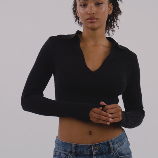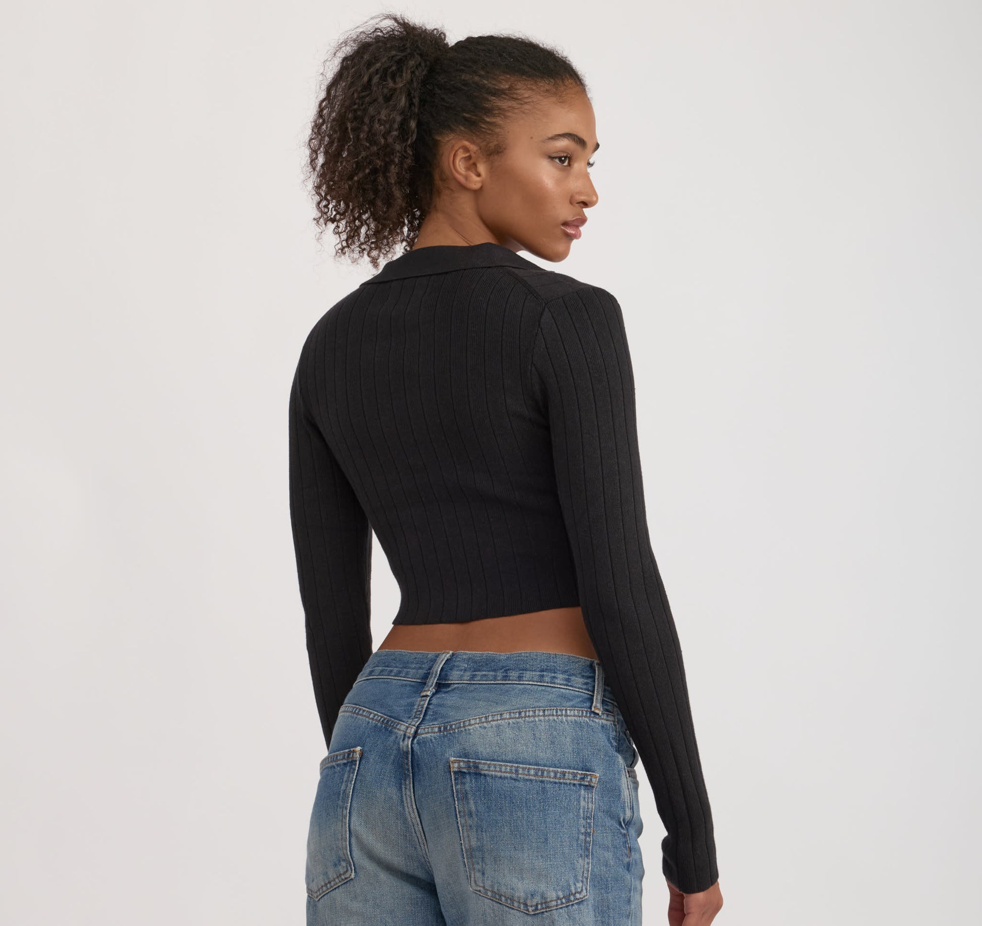 Your not-so-basic polo. Made with 86% organic cotton, it’s soft, stretchy, and finished with a v-neckline and cropped hem that bring just the right amount of edge.